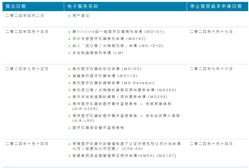 为促进由纸本申请顺利过渡至网上申请,医疗仪器资讯系统所支援的网上申请推出日期及停止接受纸本申请日期如下表所示,官方将于2024年10月14日起全面停止接受纸本申请: