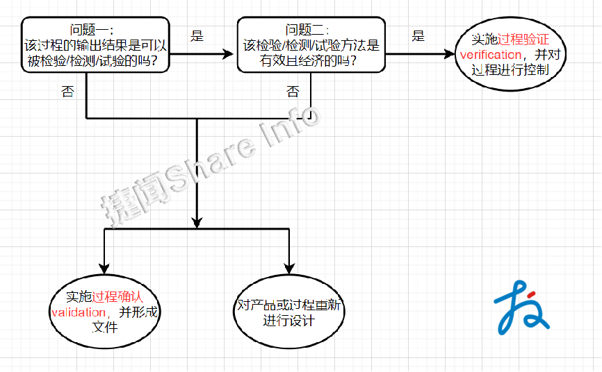 简单说来,我们应该首先确定,过程的输出结果是否可以通过经济可行、且有效的方式进行检验、检测或试验。如果可以,则实施过程验证。如果不行(例如灭菌过程、焊接过程等),则考虑过程确认。或者,考虑对产品/过程重新进行设计,直到找到经济可行且有效的验证方法。